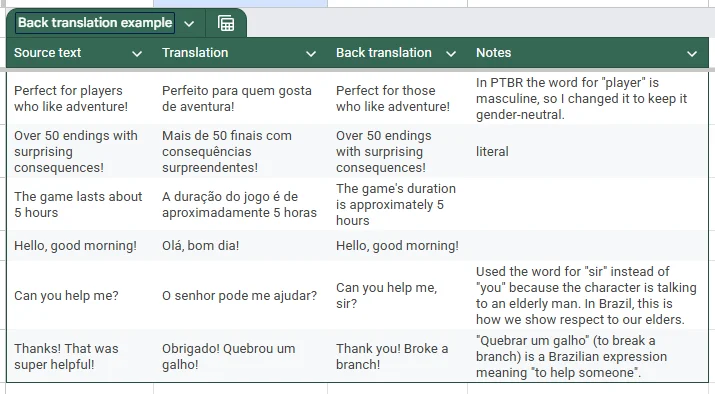 If you’re providing the text in a spreadsheet, make an extra column for your localizer to make translator’s notes on whatever expressions they feel the need to transcreate. That will give them the opportunity to explain anything they consider noteworthy. Or, if you want to know the exact meaning of every single translated sentence, you can request back translations. What is that, you ask? It’s when there’s an extra column for the translator to include a literal translation (that is, in the source language) of the localized text. In the very common occasion where a literal translation doesn’t make sense, such as in the case of idioms or slang, the translator will add a short explanation so you can approve it.