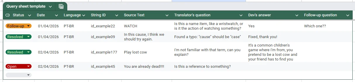In addition to that, to facilitate communication when a game is being localized into multiple languages at once, it’s customary to use an online query sheet. Basically, it’s a spreadsheet where linguists and the game development/publishing team can communicate with each other more efficiently. Here’s an entertaining example I created specifically for this post, so I don’t break any NDAs: